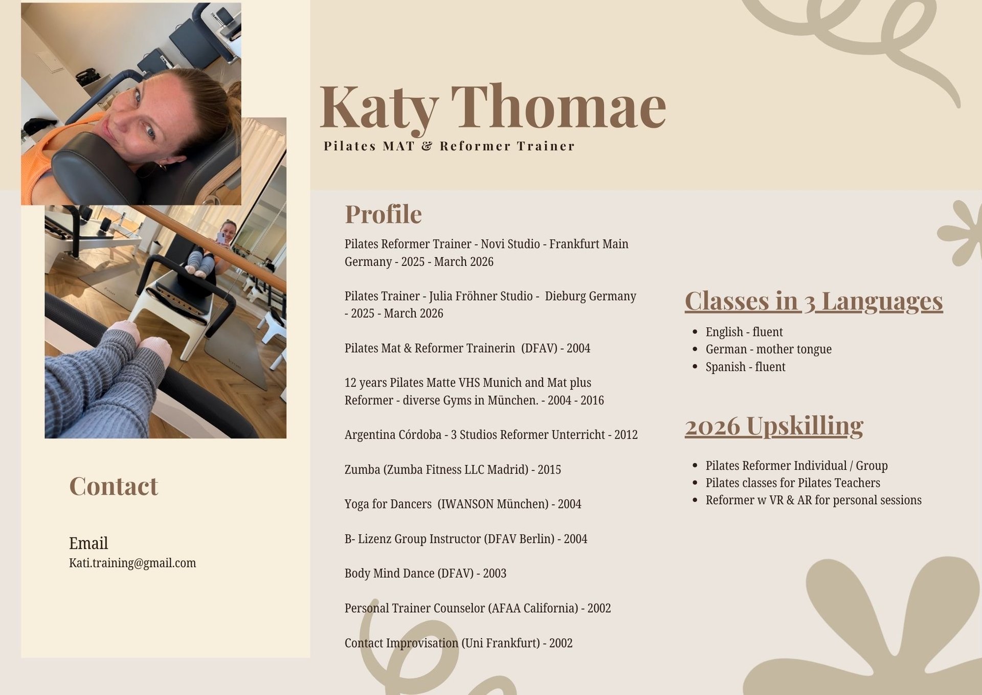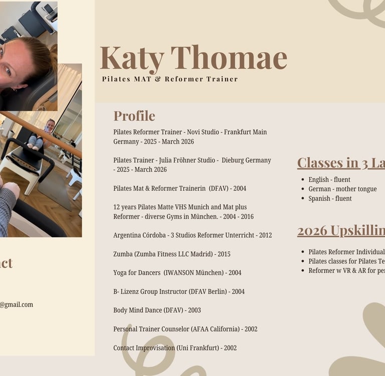 My journey began over 20 years ago, spanning from Spain to California to Argentina to Germany, where I earned my first certifications as a pilates trainer. Since then, my path has been a global one—from leading Reformer classes in Córdoba, Argentina, to teaching Mat Pilates in Munich. After returning to Frankfurt, I had the pleasure of coaching at renowned studios like Novi, giving classes in the cute town Dieburg and developing specialized programs for Golf, Tennis, and Equestrian clubs.
